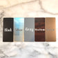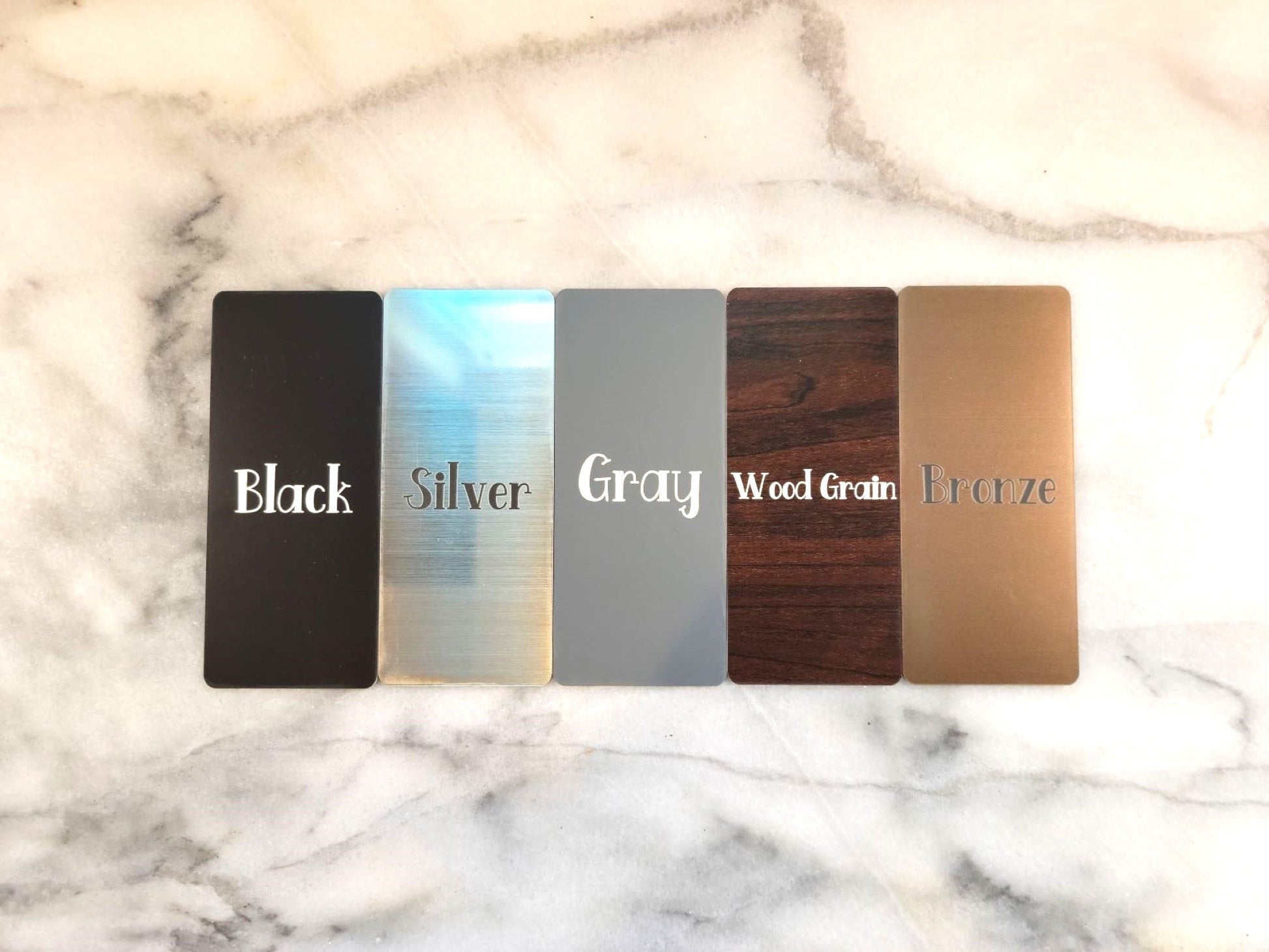 Comes in your choice of colors: black with white lettering, gray with white lettering, wood grain with white lettering, silver with black lettering, or bronze with gray lettering.